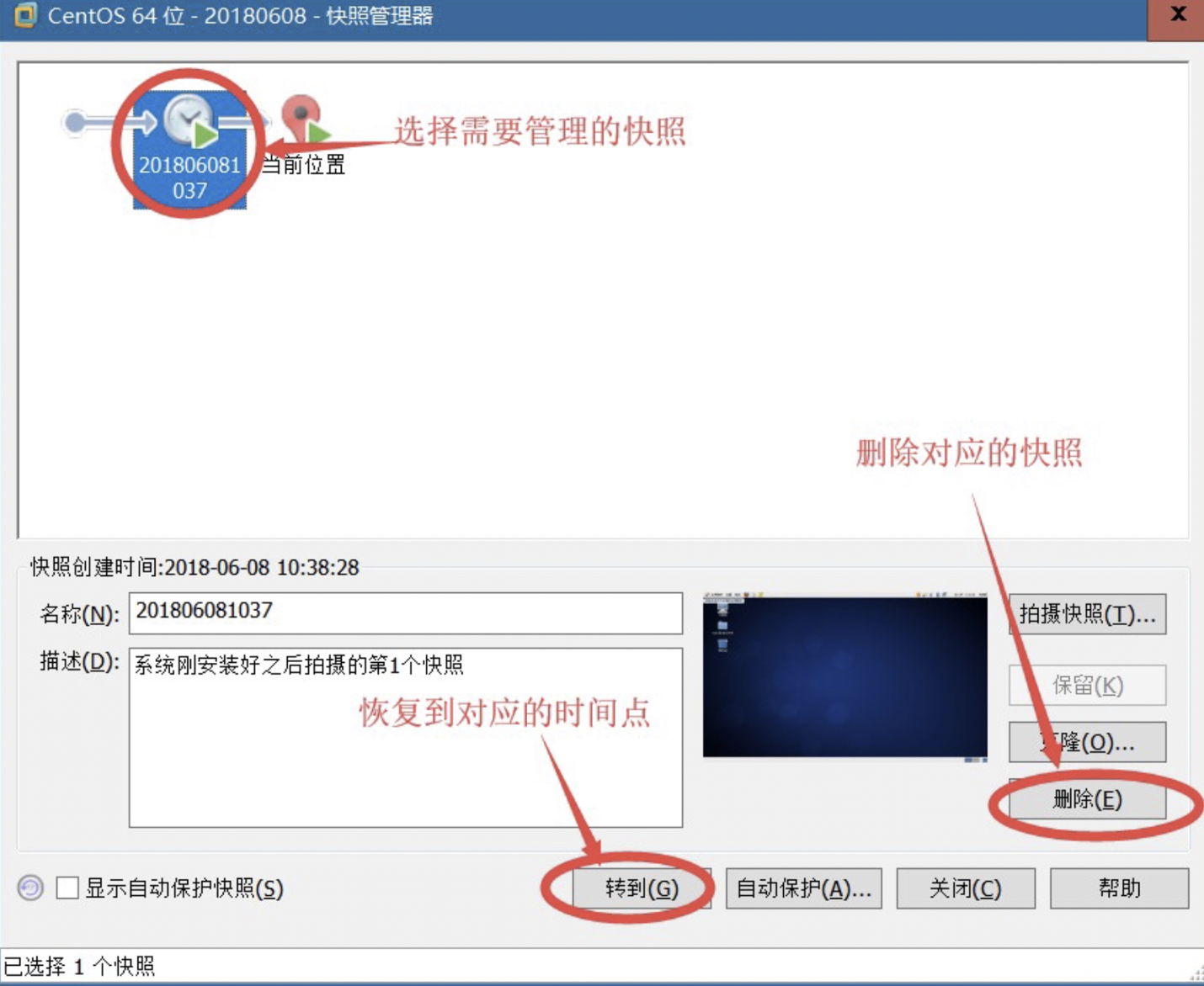 第⼆步:对于快照进⾏行行管理理(恢复、删除)