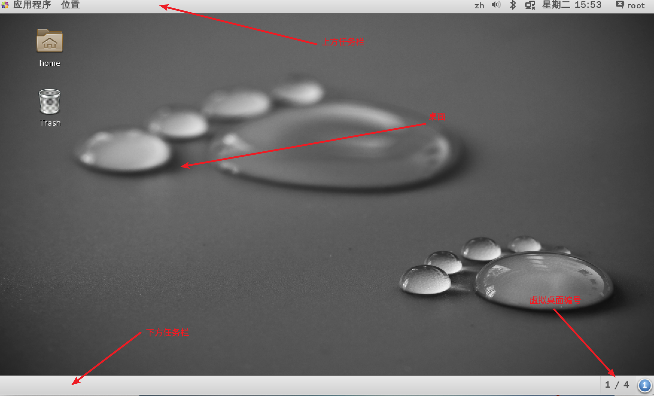 下方任务栏1/4代表多个可用的虚拟桌面,代表共有4个虚拟桌面,目前在第一个