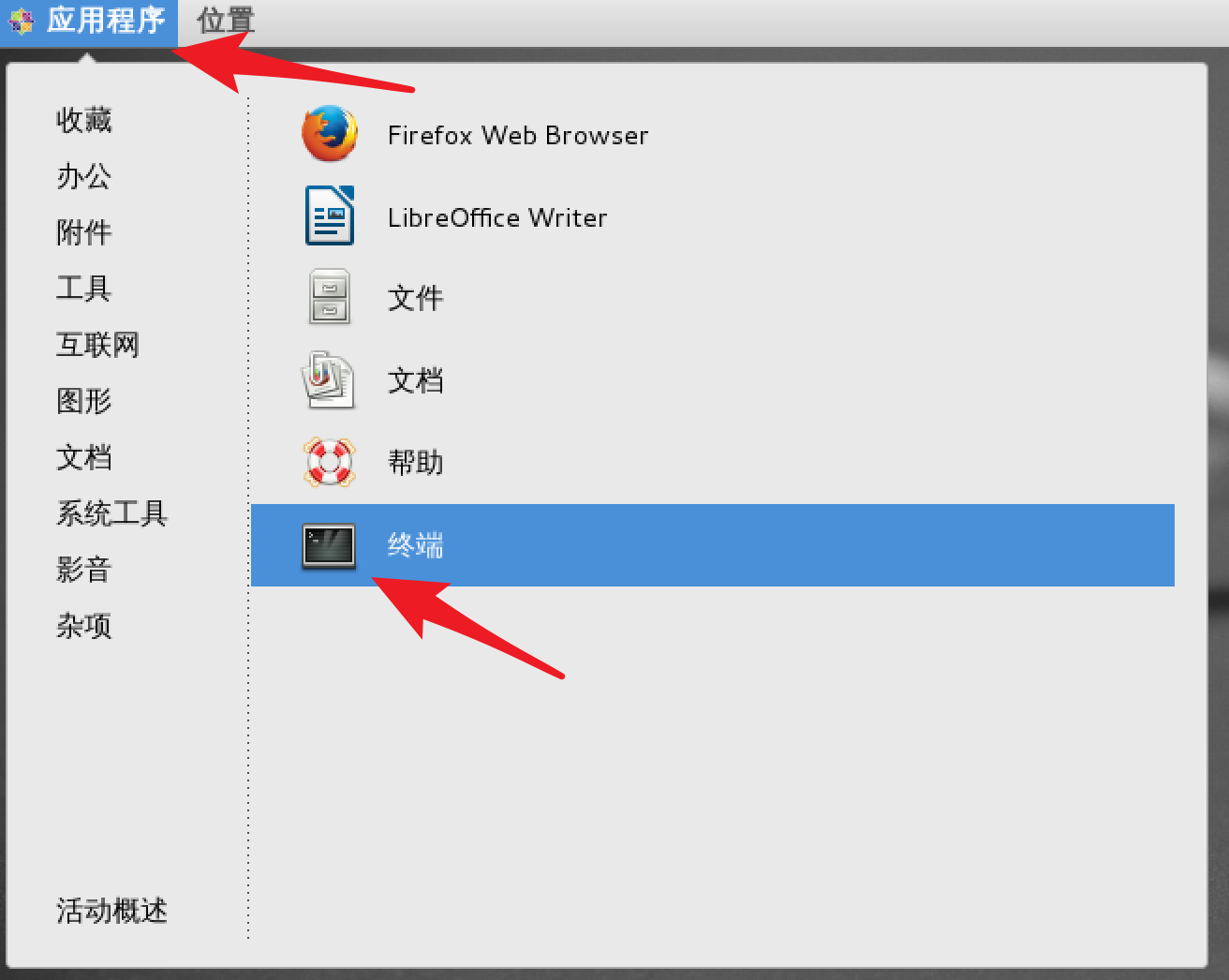 第一种方式:点击【应用程序】 - 点击 【终端】