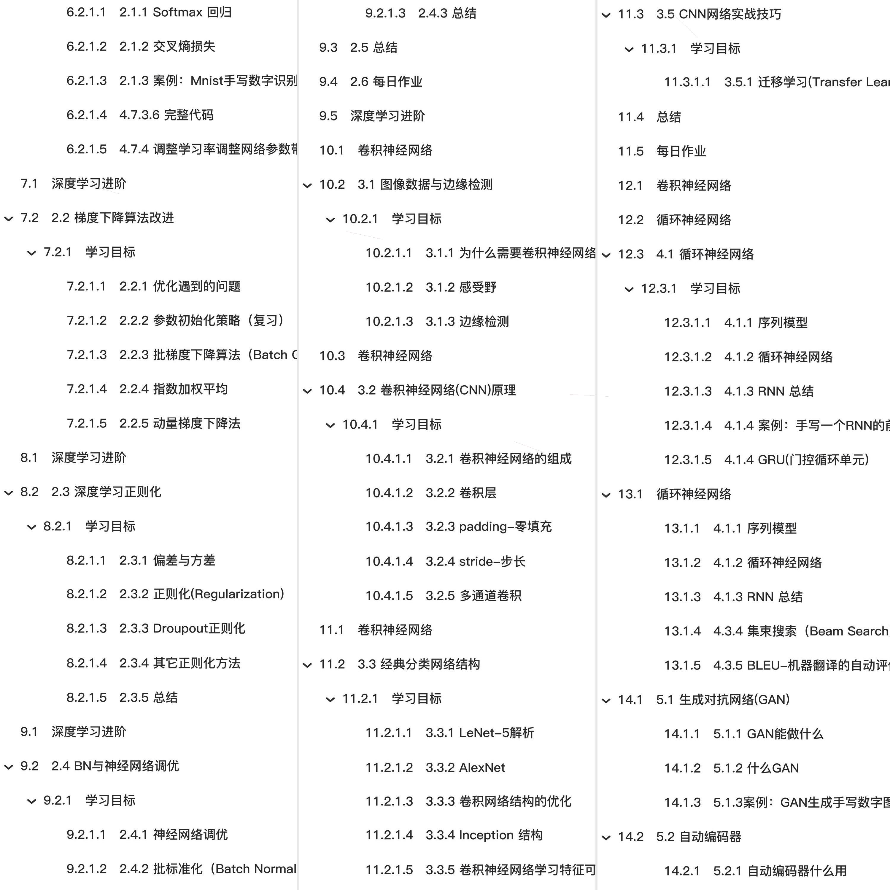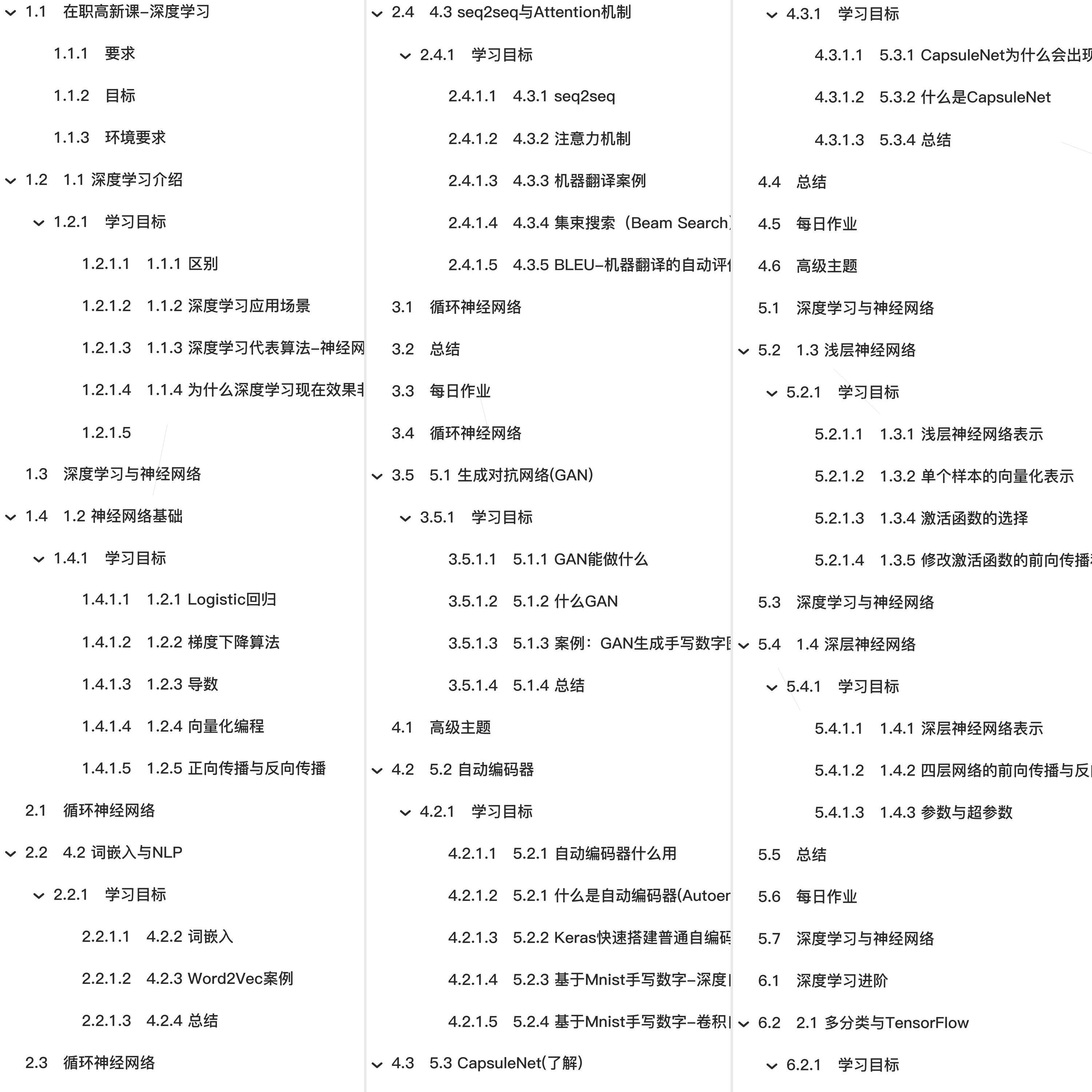 教程总体简介:在职高新课-深度学习、1.1 深度学习介绍、深度学习与神经网络、1.2 神经网络基础、循环神经网络、4.2 词嵌入与NLP、4.3 seq2seq与Attention机制、总结、每日作业、5.1 生成对抗网络(GAN)、高级主题、5.2 自动编码器、5.3 CapsuleNet(了解)、1.3 浅层神经网络、1.4 深层神经网络、深度学习进阶、2.1 多分类与TensorFlow、2.2 梯度下降算法改进、2.3 深度学习正则化、2.4 BN与神经网络调优、2.5 总结、2.6 每日作业、卷积神经网络、3.1 图像数据与边缘检测、3.2 卷积神经网络(CNN)原理、3.3 经典分类网络结构、3.5 CNN网络实战技巧、4.1 循环神经网络