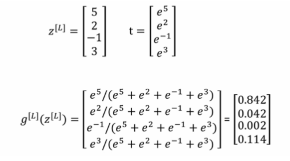 ai[L]=eZi[L]∑i=1CeZi[L]a^{[L]}i = \frac{e^{Z^{[L]}_i}}{\sum^Ce^{Z^{[L]}i}}ai[L]=∑i=1CeZi[L]eZi[L]∑i=1Cai[L]=1\sum^Ca^{[L]}_i = 1∑i=1Cai[L]=1