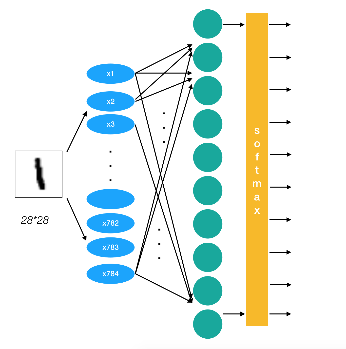 第一层参数:输入:x [None, 784] 权重:[784, 64] 偏置[64],输出[None, 64]