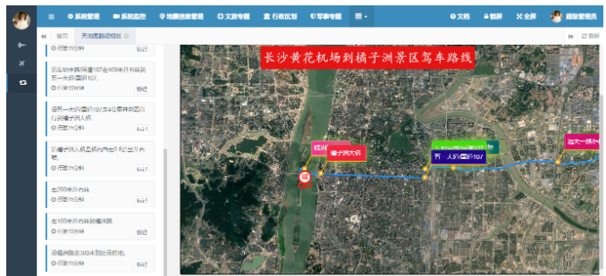 以黄花机场到橘子洲景区为例,该路径规划可视化系统将展示从机场出发,经过主要交通节点,最终到达景区的详细路线。系统支持多种出行方式,包括驾车、公交和步行,并根据用户选择的出行方式动态调整路径规划结果。同时,系统还提供路径长度、预计行驶时间等关键信息,并以直观的图形化方式展示在地图上。用户可以通过缩放、平移等操作查看路径细节,还可以点击查看沿途的POI信息,获取更多实用建议。