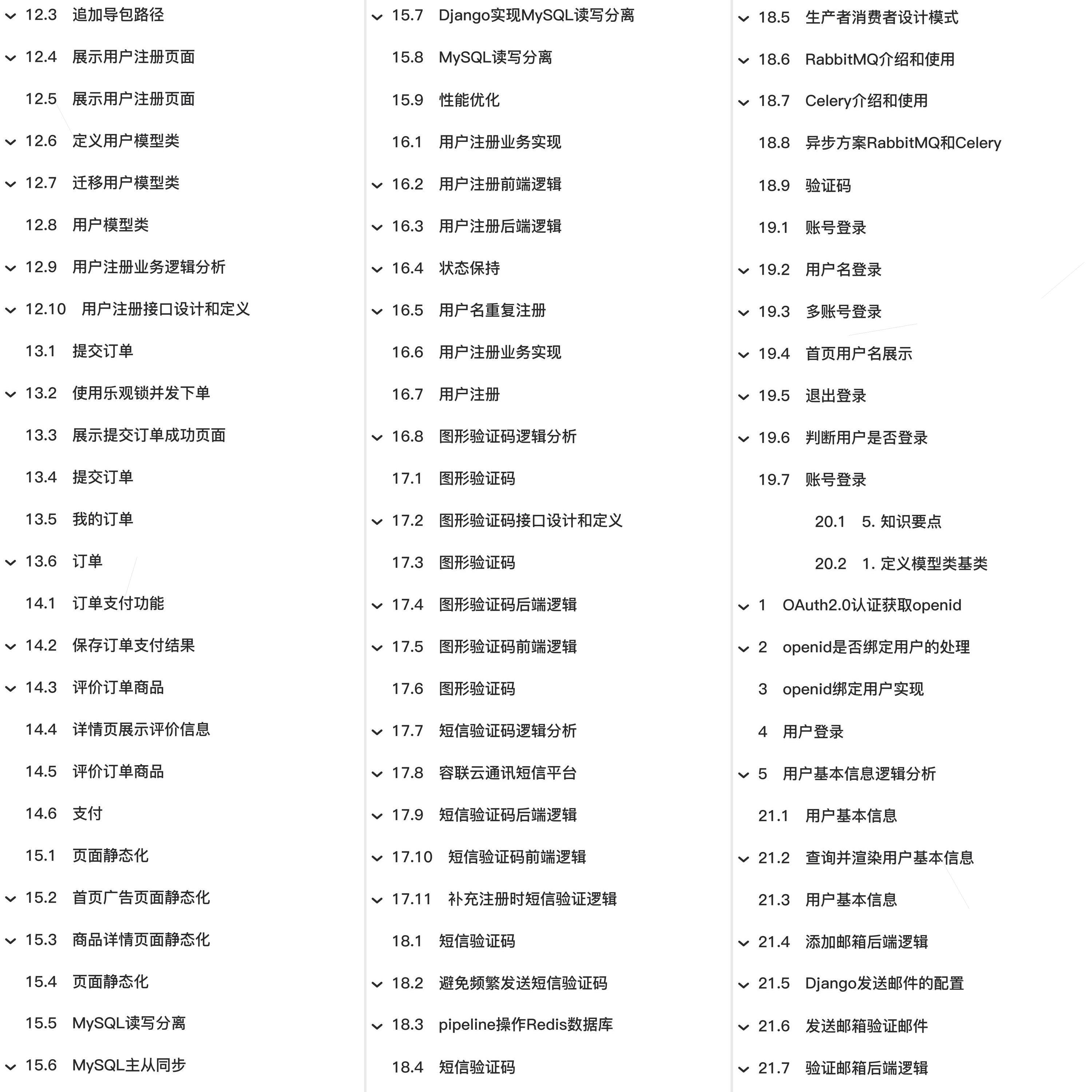 教程总体简介:欢迎来到美多商城!、项目需求分析、项目架构设计、项目介绍、创建工程、配置开发环境、配置Jinja2模板引擎、配置MySQL数据库、配置Redis数据库、配置工程日志、配置前端静态文件、工程创建和配置、项目准备、收货地址、展示地址前后端逻辑、修改地址前后端逻辑、删除地址前后端逻辑、设置默认地址、修改地址标题、修改密码、用户中心、商品数据库表设计、SPU和SKU、首页广告数据库表分析、商品信息数据库表分析、文件存储方案FastDFS、准备商品数据、容器化方案Docker、Docker和FastDFS上传和下载文件、录入商品数据和图片数据、首页广告、展示首页商品频道分类、展示首页商品广告、自定义Django文件存储类、商品列表页分析、商品列表页、列表页面包屑导航、列表页分页和排序、列表页热销排行、全文检索方案Elasticsearch、商品搜索、Haystack扩展建立索引、渲染商品搜索结果、商品详情页分析和准备、展示详情页数据、商品详情页、统计分类商品访问量、设计浏览记录存储方案、保存和查询浏览记录、用户浏览记录、商品、购物车存储方案、购物车管理、添加购物车、展示购物车、修改购物车、删除购物车、全选购物车、合并购物车、展示商品页面简单购物车、购物车、订单、结算订单、创建订单数据库表、保存订单基本信息和订单商品信息、使用事务保存订单数据、展示用户注册页面、创建用户模块子应用、追加导包路径、定义用户模型类、迁移用户模型类、用户模型类、用户注册业务逻辑分析、用户注册接口设计和定义、提交订单、使用乐观锁并发下单、展示提交订单成功页面、我的订单、订单支付功能、保存订单支付结果、评价订单商品、详情页展示评价信息、评价订