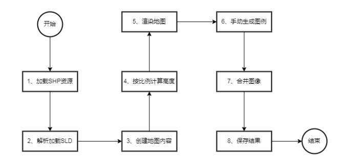 完整的成果生成流程图包含以上8个步骤,第一步是使用Geotools的方式来加载SHP资源,第二步是加载已经生成好的SLD样式描述文件,第三步是创建地图的绘制对象,第四步是按照地图的宽高比来计算新的高度,第五步是执行成果的渲染,第六步是解析SLD并且生成图例图像资源,第七步是将地图主体和图例资源进行合并,第八步是将合并后的图像资源进行本地保存,完整的处理流程就是这样的。通过以上的流程就可以实现前面一节的成果。