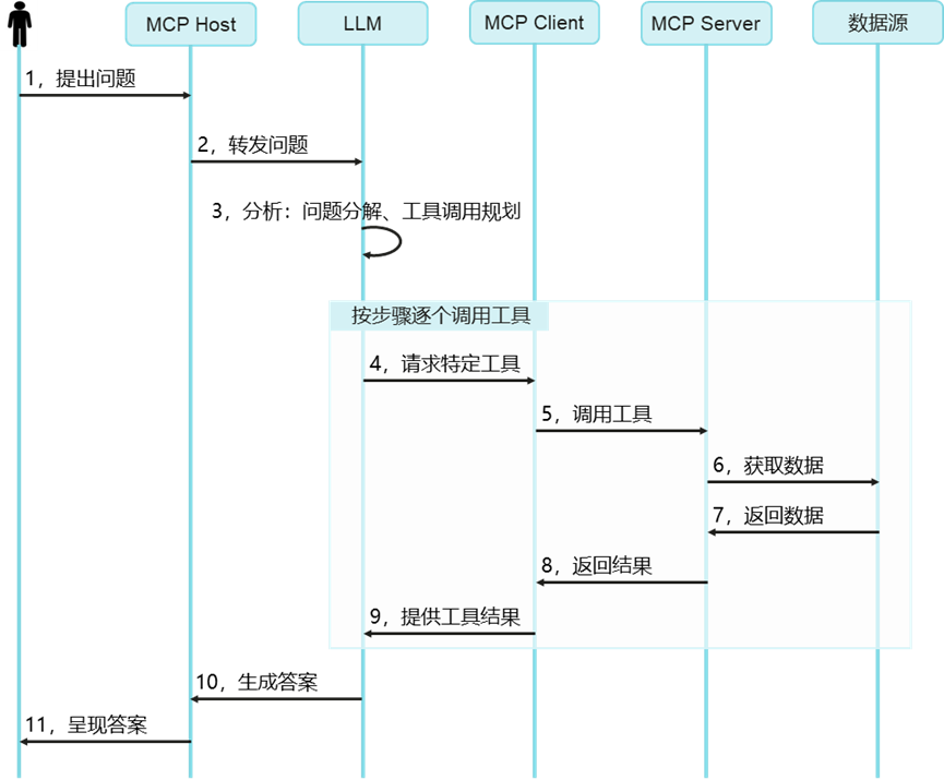这个时序图很清晰地描述了整个过程。核心是LLM,它作为大脑,承担工具选择、流程编排和结果整合的核心职责,包括: