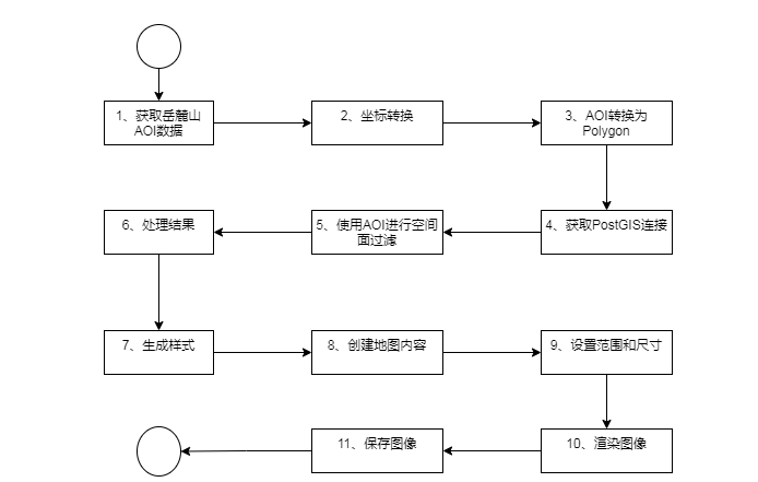 从整体来说,分为三个阶段。第一个阶段是AOI即空间查询面的构建,第二界面是基于AOI面的POI检索,第三阶段就是将两个图层进行数据叠加后渲染出图。 下面将结合流程图对重要的处理节点的逻辑进行详细的介绍。