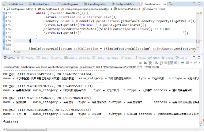 以上就是本文的主要内容,本博客将深入探讨基于Geotools对PostGIS数据库的空间查询实践,从连接配置到复杂空间查询操作,包括点查询、区域范围查询以及空间关系判断等,全方位展示如何在 Java 环境下借助 Geotools 驾驭 PostGIS 数据库,实现高效精准的空间数据检索,为相关领域开发者提供实用的技术路径,助力空间数据应用的创新拓展。如果您也需要对一个AOI数据进行范围内的POI进行分析查询,并且使用的GeoTools的基础PostGIS访问功能,那么您可以使用以上实现过程和代码进行调试。行文仓促,定有不足之处,欢迎各位朋友在评论区批评指正,不胜感激。