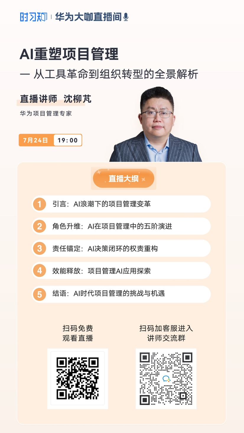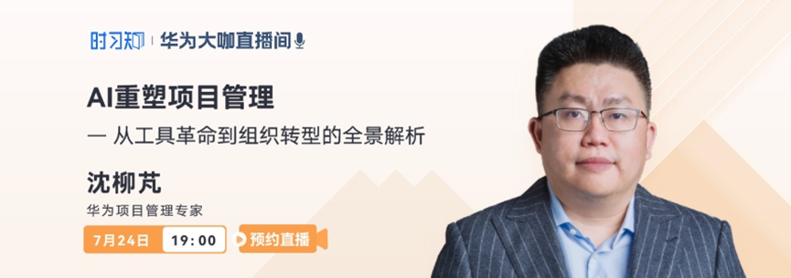 为此,我们邀请到了华为项目管理能力中心PMO负责人,拥有近20年项目管理经验的华为公司项目管理专家——沈柳芃老师做客“华为大咖直播间”,为小伙伴们分享AI在项目管理领域的发展现状、趋势与前景的洞察,助力组织和从业者应对AI驱动的项目管理变革。