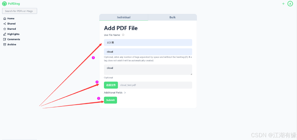 填写上传文档的名称、标签、描述信息等,将本地文档上传到PdfDing。