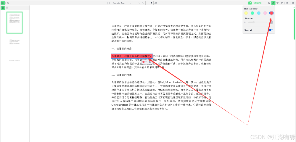 在文档预览页面,我们可以点击“Highlight”图标,选择不同颜色后,对重要句子或段落进行高亮显示。