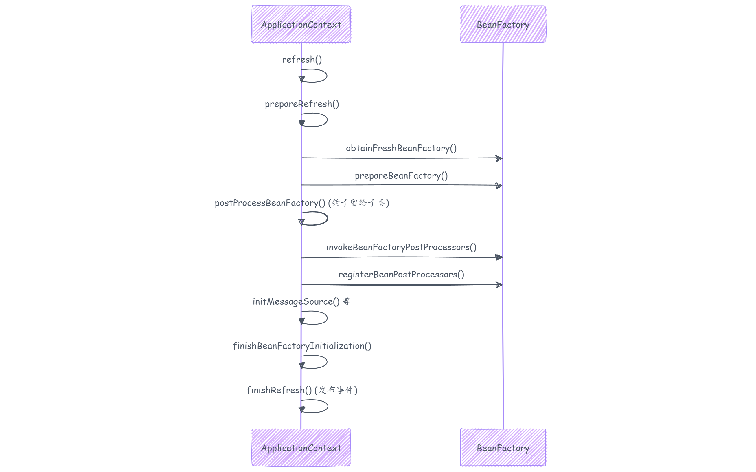 想象你在租一间毛坯办公室:prepareRefresh() 像是验收水电、检查网络是否通。obtainFreshBeanFactory() 把空房打扫干净准备装修。prepareBeanFactory() 先把公共设施(饮水机、打印机)搬进来。postProcessBeanFactory() 如果你有特殊需求(比如隔出会议室),可以在这一步动手。接着两拨装修队依次进场:第一拨改图纸(BeanFactoryPostProcessor),第二拨负责软装(BeanPostProcessor)。finishBeanFactoryInitialization() 就是把桌椅板凳全部装配好。最后 finishRefresh() 剪彩开业,通知大家可以正常办公了。