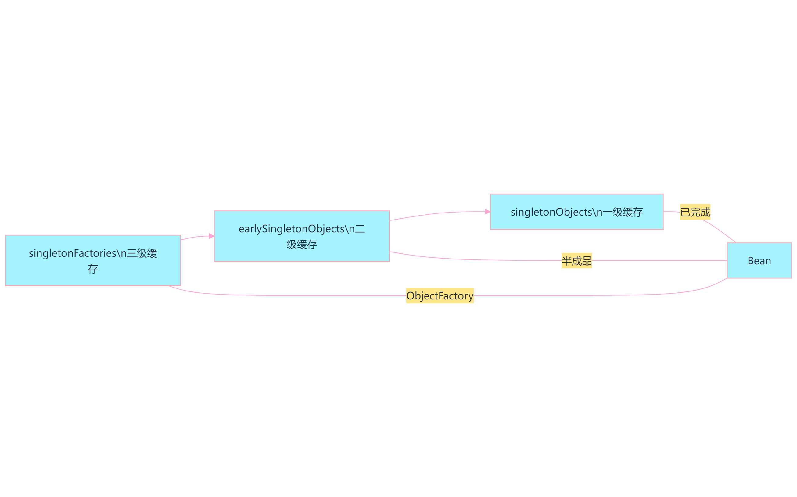 当 Bean A 构造完,但初始化前依赖了 Bean B,容器会把 A 的 ObjectFactory 暂存到三级缓存,让 B 可以先拿到「半成品 A」,避免死循环。