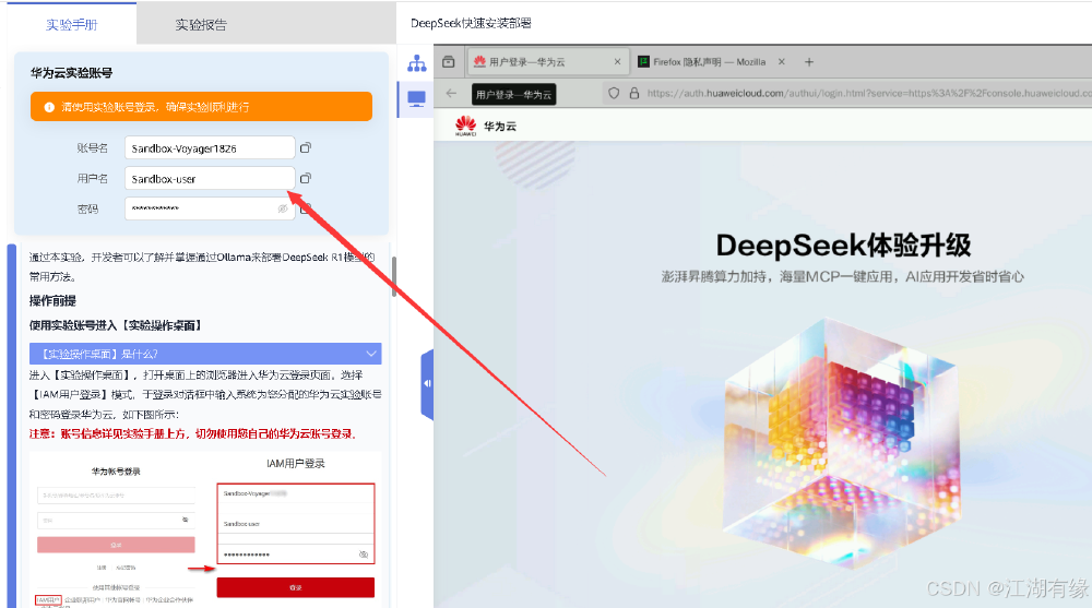 查看华为云实验账号信息:进入实验环境后,我们在左侧的实验手册中可以看到华为云实验账号。