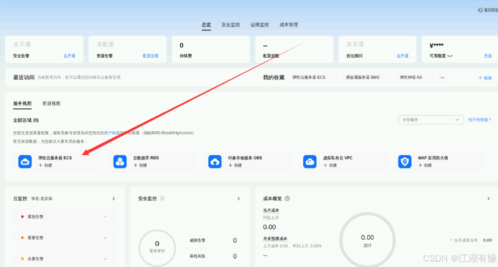 在华为云控制台中,我们点击弹性云服务器ECS【创建】选项,进入ECS购买界面。