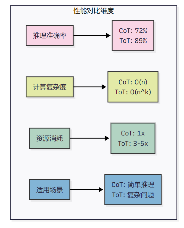 Chain-of-Thought(CoT)推理采用线性序列化的思考模式,每一步推理都基于前一步的结果。而Tree-of-Thought(ToT)则构建了树状的推理空间,能够并行探索多种解决路径并进行回溯优化。
