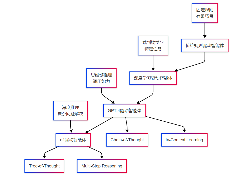 从传统的规则驱动到深度学习驱动,再到如今的大模型驱动,智能体技术经历了三次重要的范式转变。特别是Chain-of-Thought(CoT)推理链和Tree-of-Thought(ToT)思维树技术的引入,让智能体具备了类人的逐步推理能力。而o1模型在推理深度和准确性上的显著提升,更是将智能体的能力边界推向了前所未有的高度。