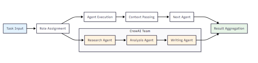 CrewAI基于**角色驱动(Role-Driven)**的设计理念,将智能体编排抽象为团队协作模式。其核心架构包含三个关键组件: