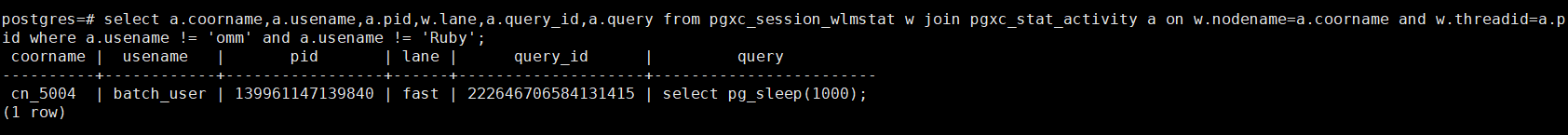 select a.coorname,a.usename,a.pid,w.lane,a.query_id,a.query from pgxc_session_wlmstat w join pgxc_stat_activity a on w.nodename=a.coorname and w.threadid=a.pid where a.usename != 'omm' and a.usename != 'Ruby';