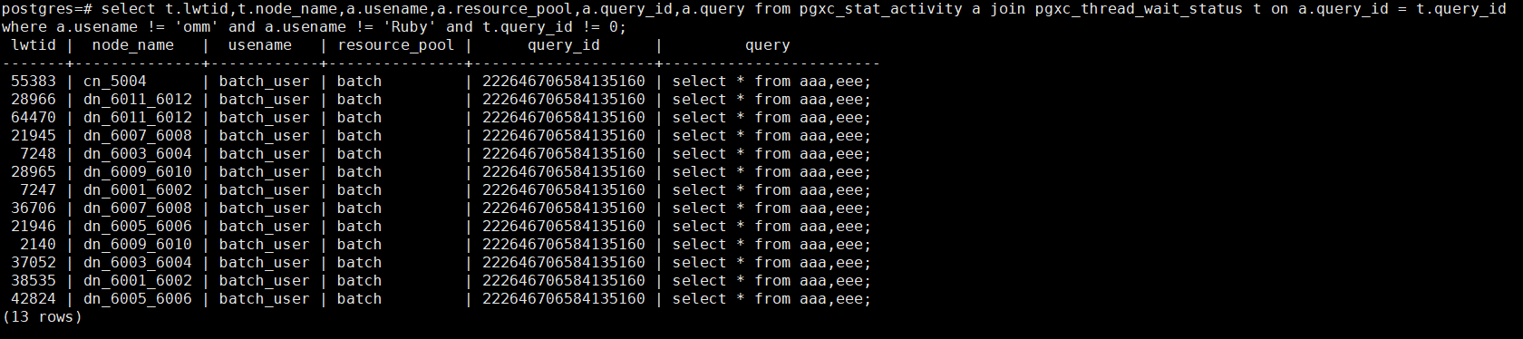 select t.lwtid,t.node_name,a.usename,a.resource_pool,a.query_id,a.query from pgxc_stat_activity a join pgxc_thread_wait_status t on a.query_id = t.query_idwhere a.usename != 'omm' and a.usename != 'Ruby' and t.query_id != 0;