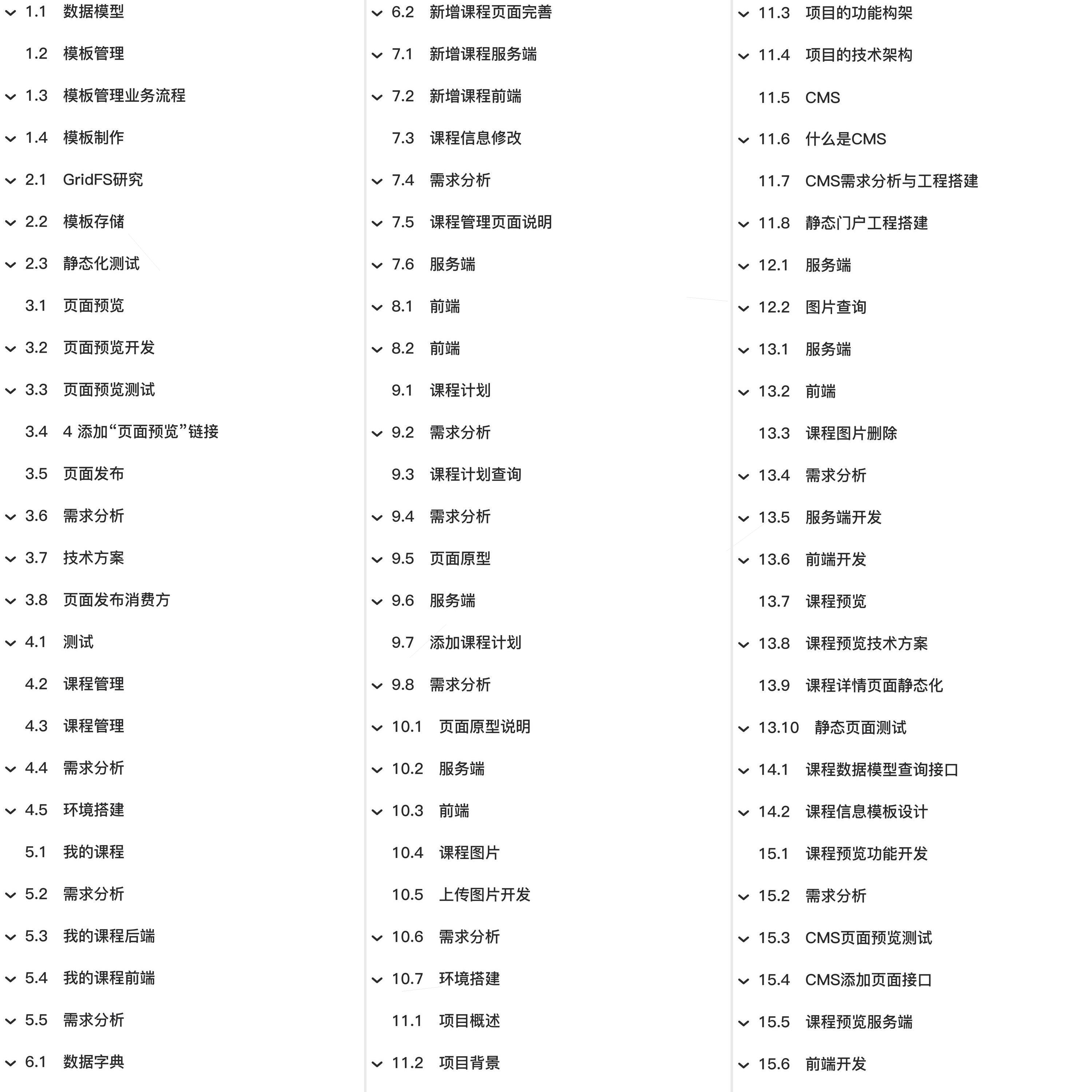 教程总体简介:数据模型、模板管理、模板管理业务流程、模板制作、GridFS研究、模板存储、静态化测试、页面预览、页面预览开发、页面预览测试、4 添加“页面预览”链接、页面发布、需求分析、技术方案、页面发布消费方、测试、课程管理、环境搭建、我的课程、我的课程后端、我的课程前端、数据字典、新增课程页面完善、新增课程服务端、新增课程前端、课程信息修改、课程管理页面说明、服务端、前端、课程计划、课程计划查询、页面原型、添加课程计划、页面原型说明、课程图片、上传图片开发、项目概述、项目背景、项目的功能构架、项目的技术架构、CMS、什么是CMS、CMS需求分析与工程搭建、静态门户工程搭建、图片查询、课程图片删除、服务端开发、前端开发、课程预览、课程预览技术方案、课程详情页面静态化、静态页面测试、课程数据模型查询接口、课程信息模板设计、课程预览功能开发、CMS页面预览测试、CMS添加页面接口、课程预览服务端、课程发布、CMS一键发布接口、课程发布接口、搜索服务、课程搜索需求分析、课程索引、准备课程索引信息、搭建ES环境、Logstash创建索引、搜索前端技术需求、了解SEO、服务端渲染和客户端渲染、Nuxt.js入门、Nuxt.js介绍、创建Nuxt工程、页面布局、路由、搜索页面、分页查询、按分类搜索、集成测试、在线学习与媒资管理、在线学习需求分析、需求描述、视频点播解决方案、视频编码、视频编码格式、生成m3u8/ts文件、播放器、CMS页面管理需求、后端工程搭建、导入CMS数据库、MongoEngine入门、在Django中使用MongoDB、定义文档、开发环境、上传文件、断点续传