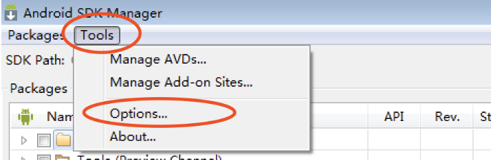 - 在弹出的android sdk manager页面,点击tools, 下啦框点击options