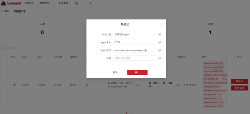 (1)在Sermant Backend中,点击实例状态标签页;选择状态为在线的实例,点击热插拔按钮;在弹框中选择命令类型:安装外部Agent。并填写Agent名称、Agent路径等信息。最后点击确认即可下发挂载指令。此处我们准备了一个版本为版本2.10.0的OTEL Agent的Jar包(确保目标机器路径可达),只需按照说明填入Agent的路径。