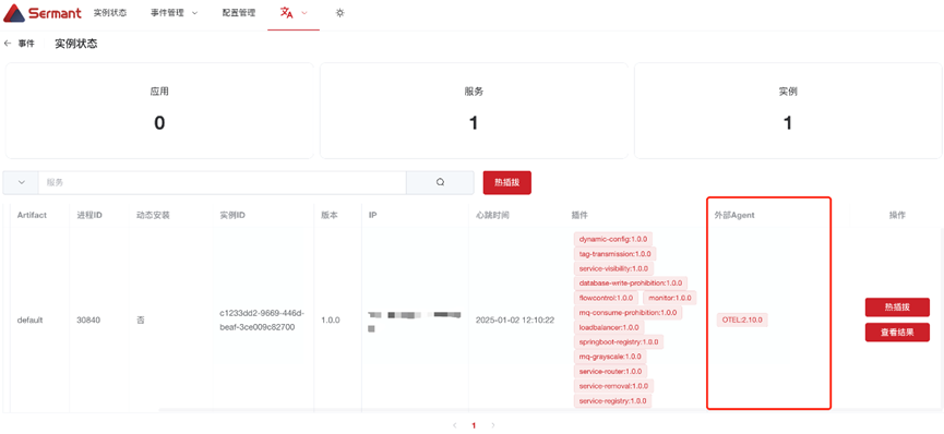 (2)在挂载命令执行后,在Sermant Backend的实例状态标签页面,可以通过外部Agent状态栏可以查看当前已经挂载的外部Agent的信息,其中包含了名称和版本信息。如下所示: