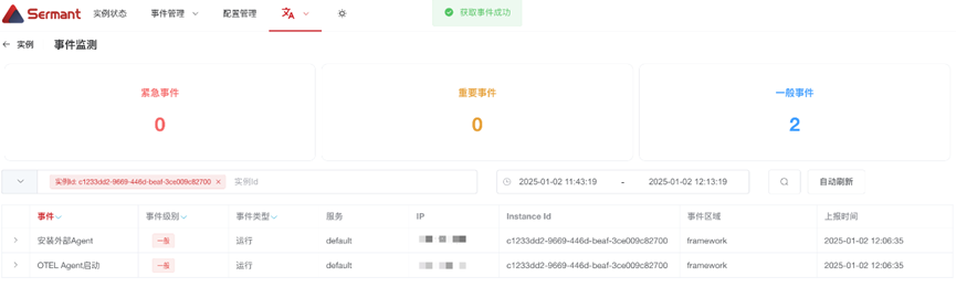 (3) 另外,Sermant还具备事件上报机制,可以把Sermant运行时的关键事件上报至Sermant Backend中,用于对Sermant自身的观测。对于OTEL等外部Agent的挂载,Sermant也支持了事件上报和观测。在实例状态标签页面点击查看结果或进入事件管理的监测页面,可以看到安装外部Agent和OTEL Agent启动(OTEL适配,其他Agent暂无)上报的事件。