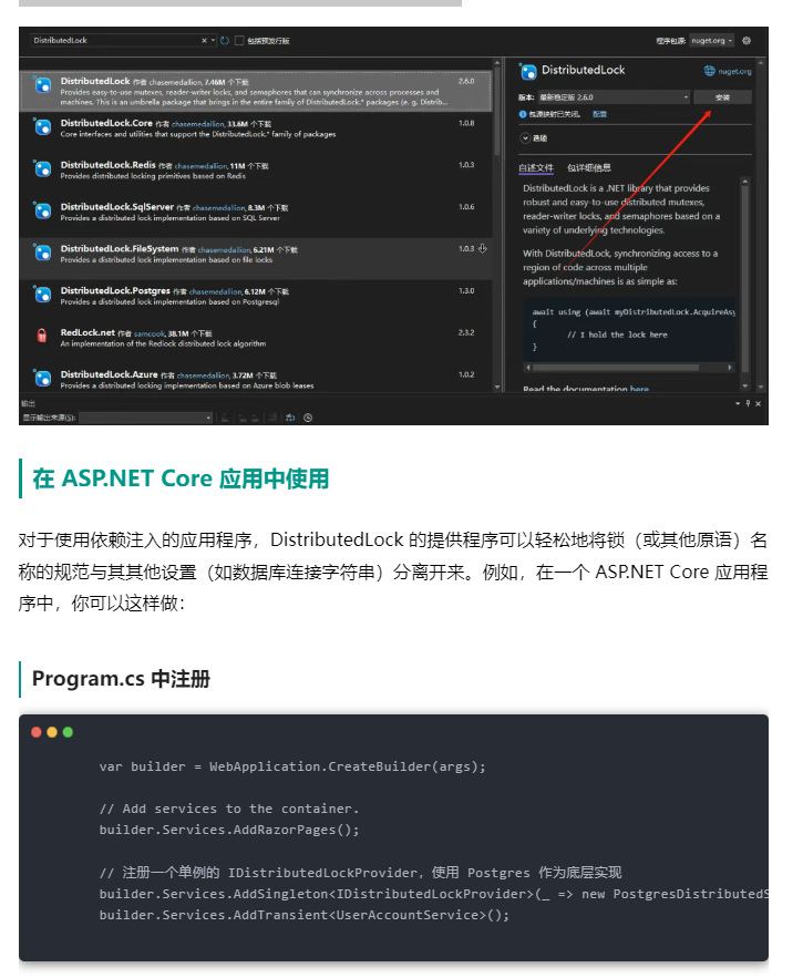 在 NuGet 包管理器中搜索:DistributedLock 安装。