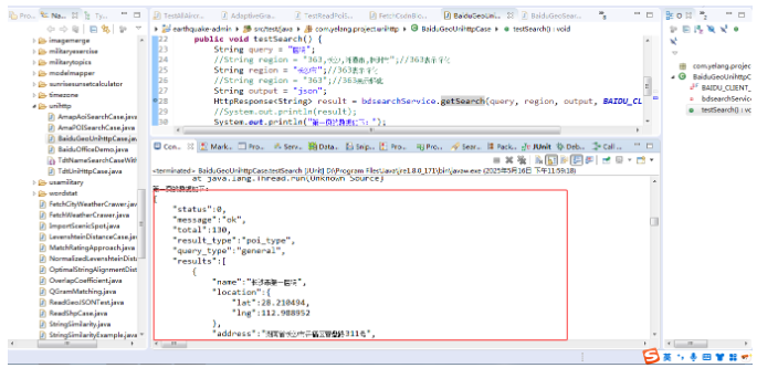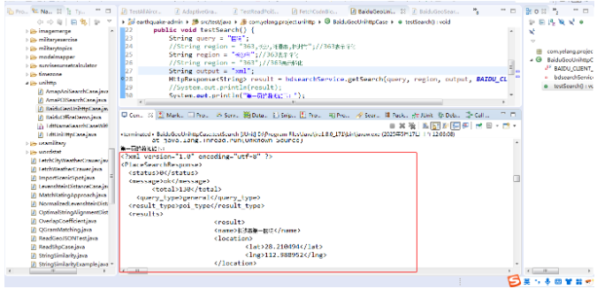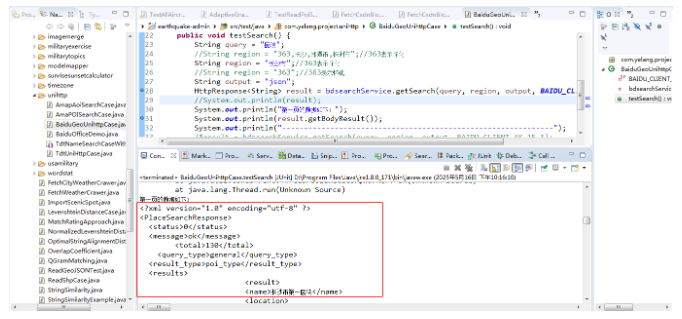 完成以上的定义之后,我们就可以来调用相关的接口实现关键字的指定行政区划检索,执行结果如如下图所示: