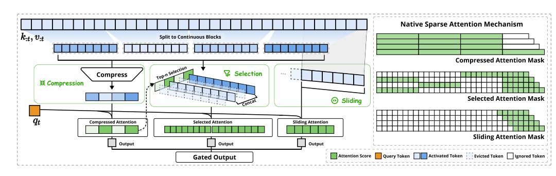 为应对这些挑战,我们提出了 NSA(Natively trainable Sparse Attention)—— 一种原生可训练的稀疏注意力机制,它将算法创新与硬件对齐优化相结合,实现了高效的长上下文建模。NSA 采用动态分层稀疏策略,结合粗粒度的 token 压缩与细粒度的 token 选择,在保留全局上下文感知能力的同时确保了局部精度。本文将详细介绍 NSA 的设计理念、技术细节与实验结果,展示其在效率与性能上的双重突破。