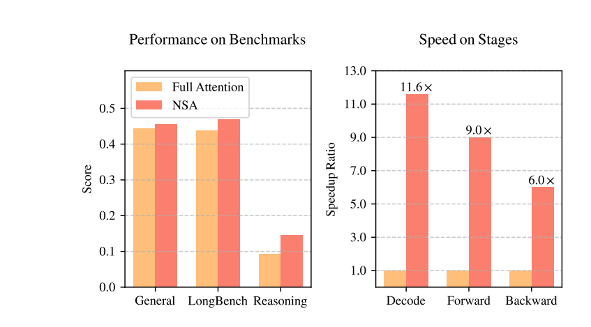 - 在 GSM8K(数学推理)任务中,NSA 的得分从486 提升至 0.520,提升了 0.034,显示出其在数学问题求解中的多步推理能力更强。