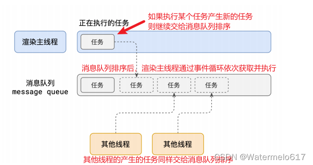 简而言之,渲染主线程的消息队列就是渲染主线程的任务管家,负责给渲染主线程要执行的任务进行排序、管理、调度。渲染主线程只需要一直检查消息队列里面有没有任务,按序执行即可,但消息队列要考虑的可就多了(bushi)