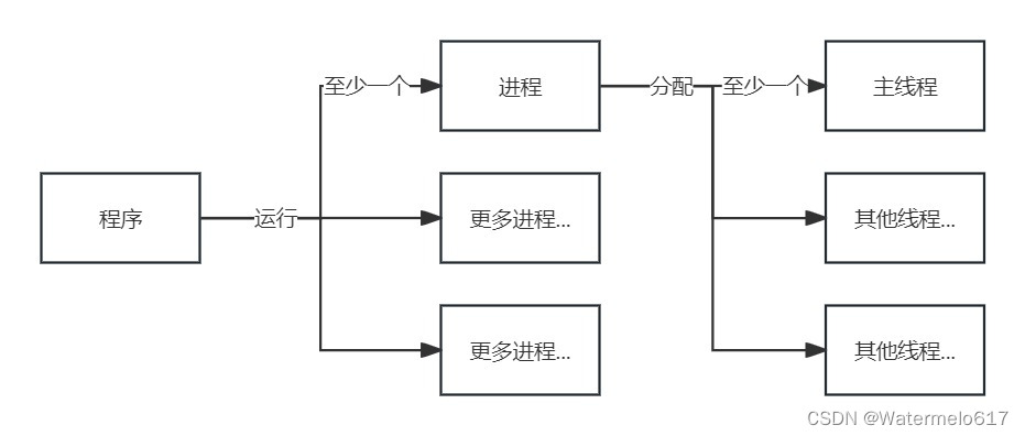 - 进程是程序某一部分或整体的运行实例,每个程序运行都至少需要一个进程。(但不一定只有一个,为了保证程序的稳定性,往往会有多个进程,一个进程崩溃不会导致整个程序崩溃)