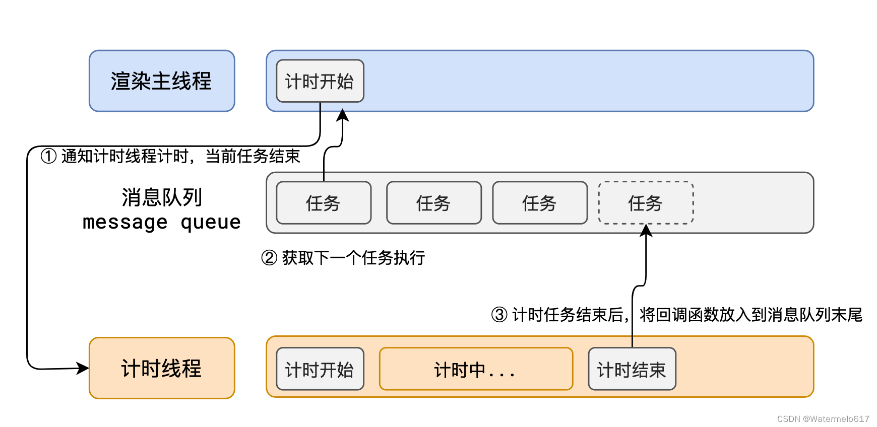 - 计时完成后需要执行的任务 —— setTimeout、setInterval
