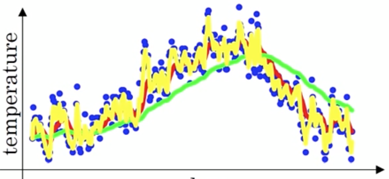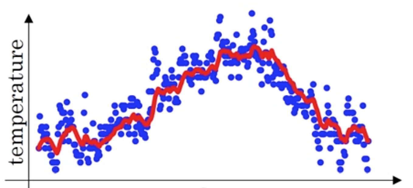 那么这样的气温值变化可以理解成优化的过程波动较大,异常较多。那么怎么平缓一些呢,这时候就要用到加权平均值了,如指数加权平均值。首先看一些效果。