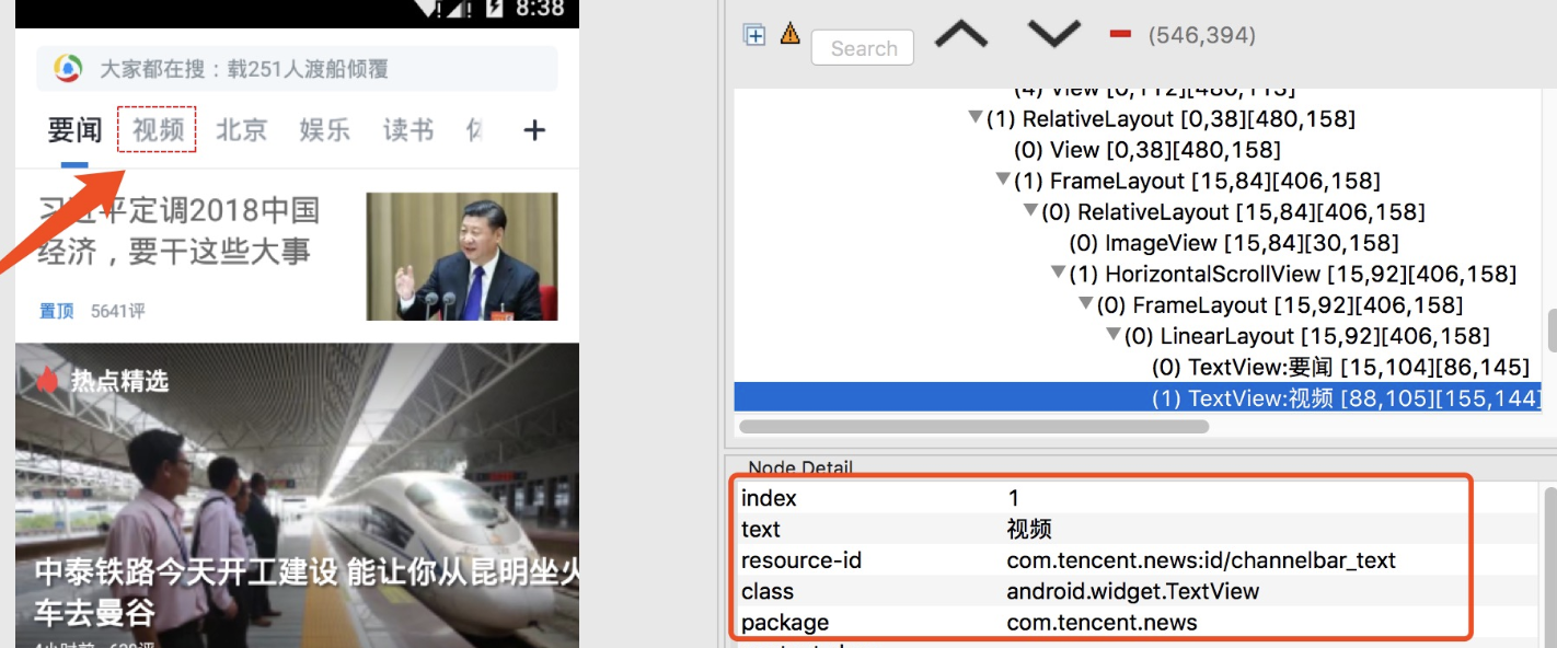 5.选择截图上需要查看的控件,即可浏览该控件的id,class,text,坐标等信息