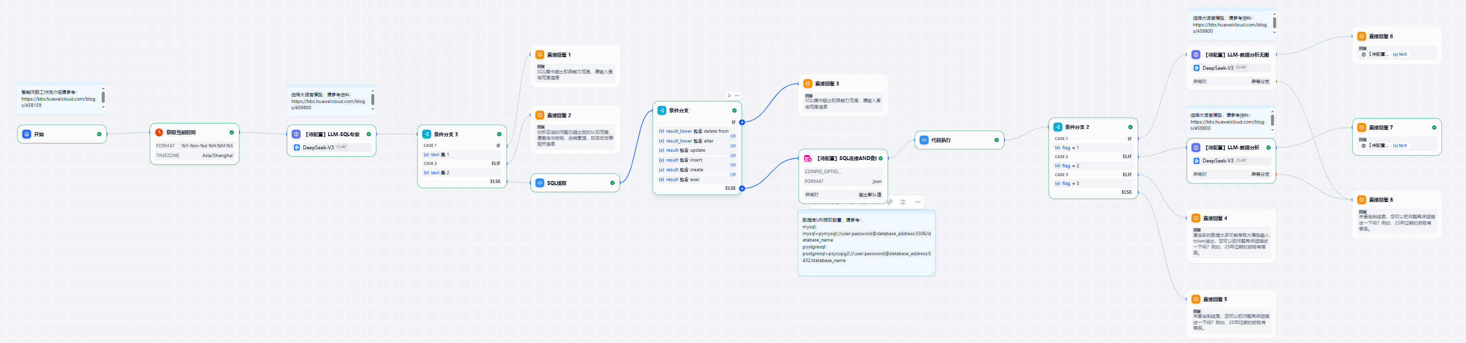 功能详细介绍:对查询结果的条数长度进行分类,根据flag的值分别走LLM-数据无图分析、LLM-数据分析、token溢出说明分支和查询无结果分支。