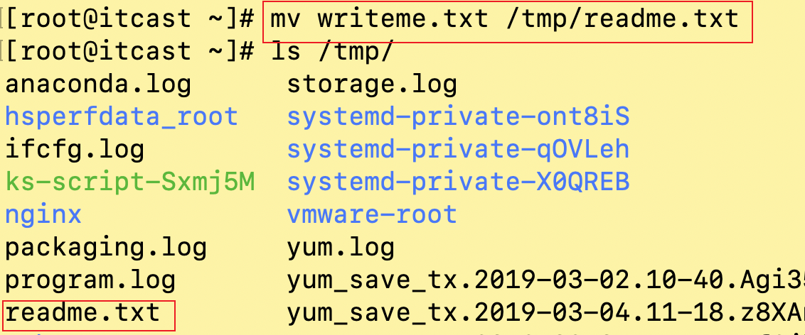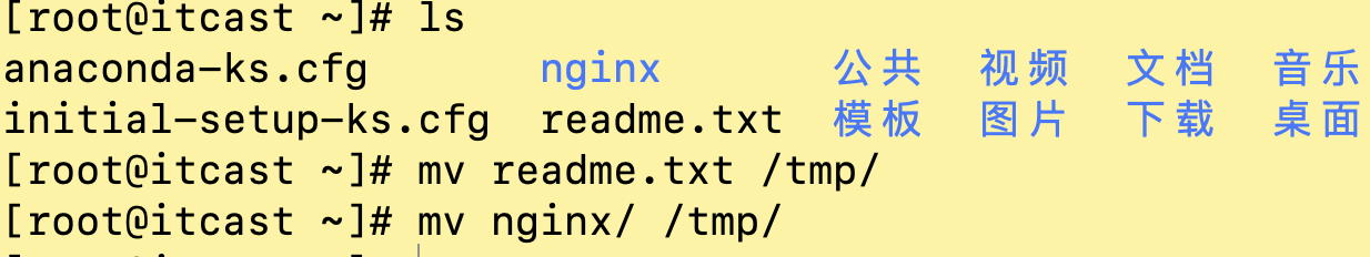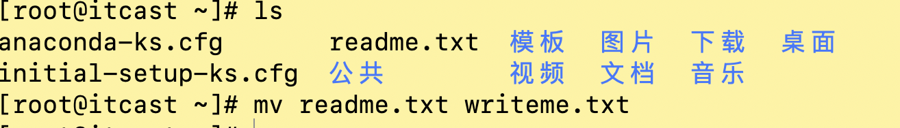 在linux中重命名的命令也是mv,语法和移动语法一样。区别在于重命名一般是路径不变,名称改变。