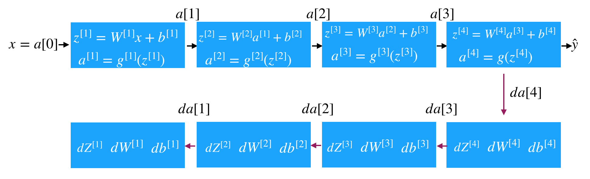 z[L]=W[L]a[L−1]+b[L],a[L]=g[L]z^{[L]} = W^{[L]}a^{[L-1]}+b^{[L]}, a^{[L]}=g^{[L]}(z^{[L]})z[L]=W[L]a[L−1]+b[L],a[L]=g[L](z[L])a[L−1]a^{[L-1]}a[L−1]a[L]a^{[L]}a[L]