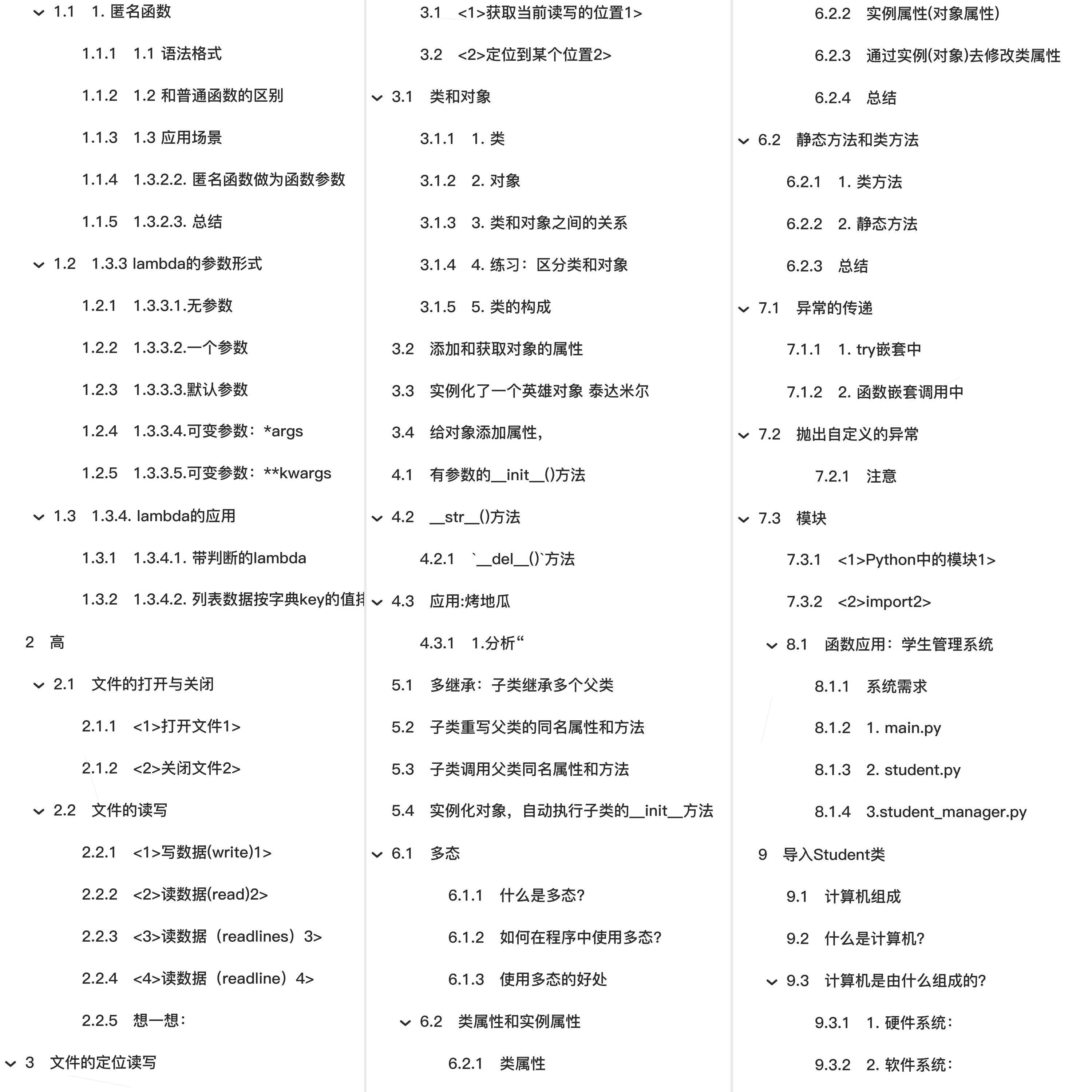 教程全知识点简介:1.Python函数高级特性包括匿名函数(lambda语法格式、与普通函数区别、应用场景、参数形式)。2. 文件操作涵盖文件打开关闭、文件读写(write写数据、readlines读数据)。3. 面向对象编程包括类和对象(类定义、对象创建、类对象关系)、类构成、self关键字、对象属性操作、构造方法__init__、字符串方法__str__、多继承、子类重写、多态概念及应用、类属性和实例属性、静态方法和类方法。4. 异常处理涵盖异常传递(try嵌套、函数嵌套调用)、自定义异常抛出。5. 模块系统包括Python模块概念、import导入机制、学生管理系统应用。6. 计算机基础涉及计算机组成、硬件系统、程序处理机制、编程语言概念、Python介绍、解释器作用。7. Python语法基础包括注释分类、输出(格式化输出、转义字符、结束符)、输入语法、数据类型转换、运算符(算数运算符)。8. 控制流程涵盖判断语句(if语句、if-else、if-elif-else、三目运算、if嵌套)、循环语句(while循环、for循环、break和continue)。9. 数据容器包括字符串操作(rfind、partition、splitlines、isalpha、isdigit)、列表(列表格式、相关操作、循环遍历、嵌套)、元组、字典(键值访问)、公共方法、容器类型转换、推导式(列表推导式、多for循环)。10. 函数进阶涵盖函数返回值、函数文档说明、函数嵌套调用、变量作用域(局部变量、全局变量、global关键字)、拆包和变量交换、引用概念、可变不可变类型、函数使用注意事项