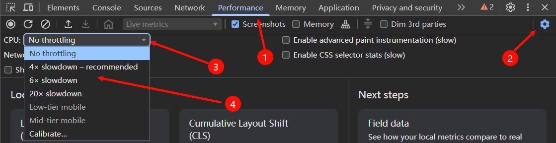 在降低 CPU 性能 4x 减速后,再使用官网中的树表大数据demo体验滚动,用户反馈的问题也成功地“轻松”复现了。