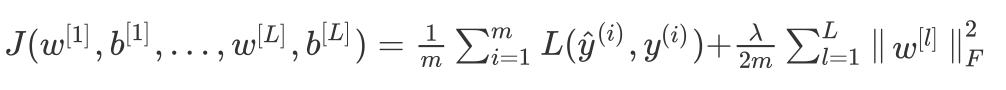 J(w,b)=1m∑i=1mL(y^(i),y(i))+λ2m∣∣w∣∣22J(w,b) = \frac{1}{m}\sum_{i=1}^mL(\hat{y}^{(i)},y^{(i)})+\frac{\lambda}{2m}{||w||}^2_2J(w,b)=m1∑i=1mL(y^(i),y(i))+2mλ∣∣w∣∣22