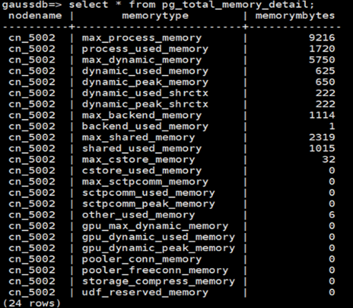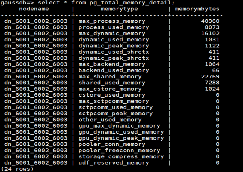 步骤2:在CN或DN节点执行SQL语句,查询实时内存统计信息。