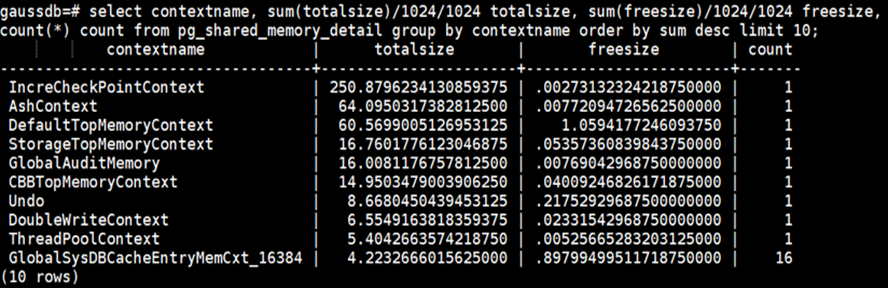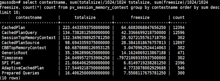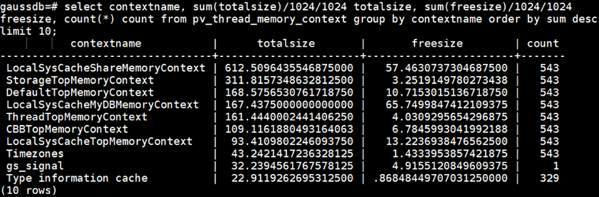 步骤6:查看数据库进程全局的内存上下文占用大小,按照内存上下文分类从大到小排序,选择排序Top10的数据。