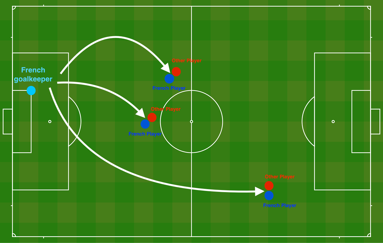 每个点对应于足球场上的位置,在法国守门员从足球场的左侧射球之后,足球运动员用他/她的头击球。