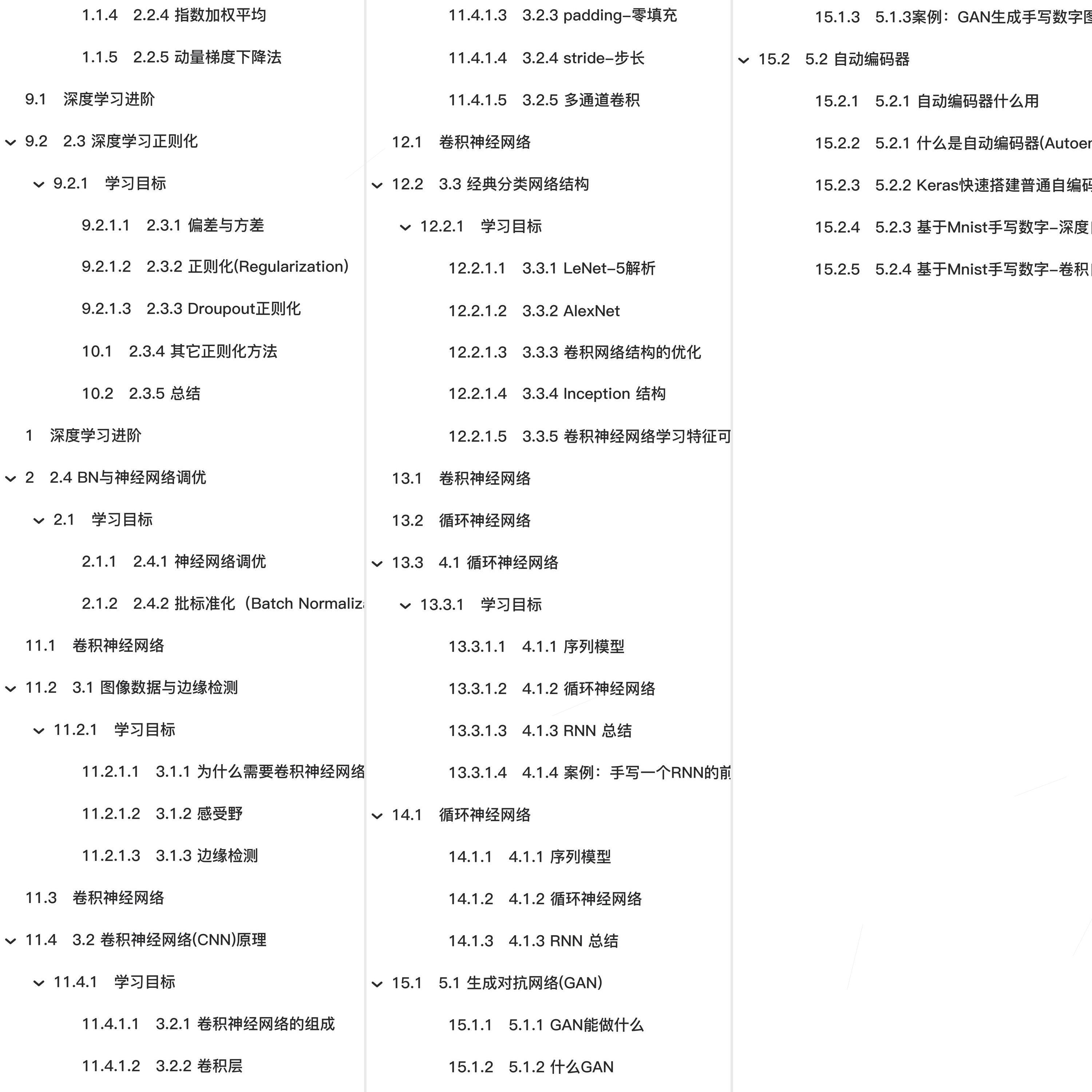 🏆🏆🏆教程全知识点简介:1.1 深度学习介绍 深度学习与神经网络 1.2 神经网络基础 1.3 浅层神经网络 2.1 多分类与 TensorFlow 5、得出每次训练的准确率(通过真实值和预测值进行位置比较,每个样本都比较) 2.2 梯度下降算法改进 2.3.4 其它正则化方法 2.4 BN 与神经网络调优 3.1 图像数据与边缘检测 3.2 卷积神经网络(CNN)原理 3.3 经典分类网络结构 4.1 循环神经网络 4.1.4 GRU(门控循环单元) 4.1.5 LSTM(长短记忆网络) 4.2 词嵌入与 NLP 学习目标 4.2.2 词嵌入 4.2.3 Word2Vec案例 4.3 seq2seq 与 Attention机制 4.3.2 注意力机制 4.3.3 机器翻译案例 4.3.4 集束搜索(Beam Search) 4.3.5 BLEU-机器翻译的自动评估方法 4.7.3.6 完整代码 5.1 生成对抗网络(GAN) 5.2 自动编码器