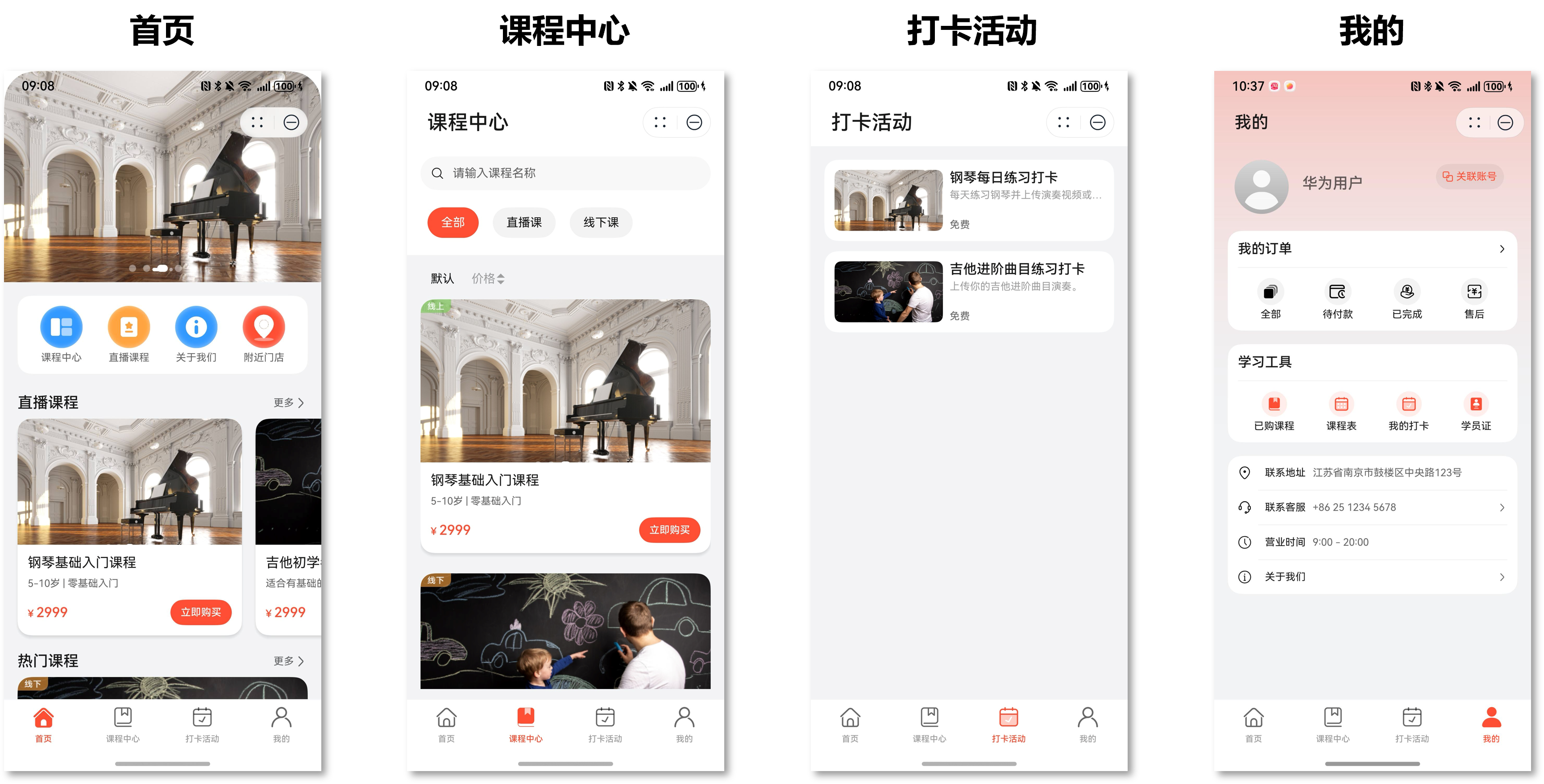 1. 首页:提供课程中心、直播课程、关于我们和附近门店功能入口,展示直播课程列表和热门课程列表,展示门店位置地图和门店信息。