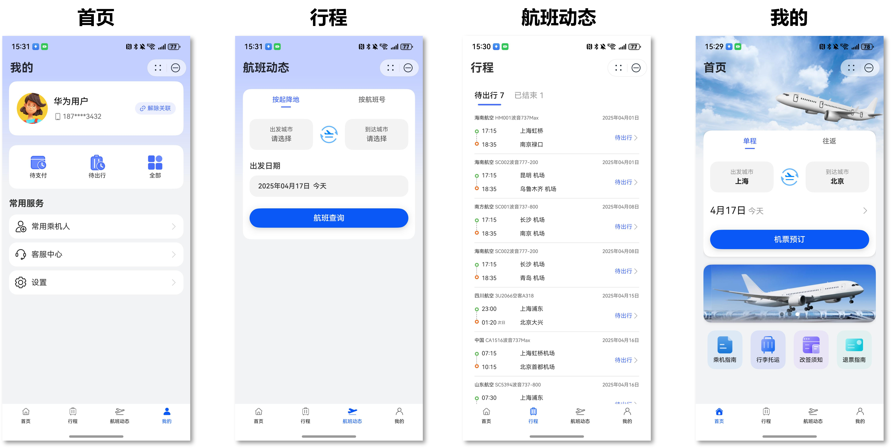 4. 我的:展示个人信息、订单中心,常用乘机人、客服中心、设置等功能。